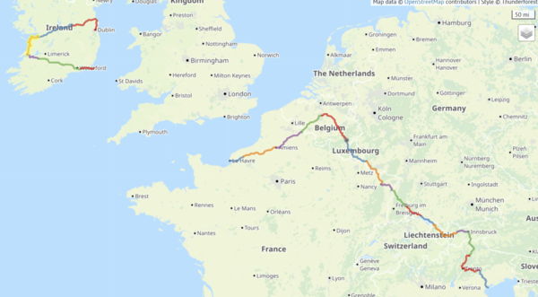Hi. I just created many journeys re-creating my cycle from Dublin to Venice way back in 1979. I wanted to get the maps and elevations for each day. Cycle.travel worked very well for that. Any ideas for combining them all to get a combined map?